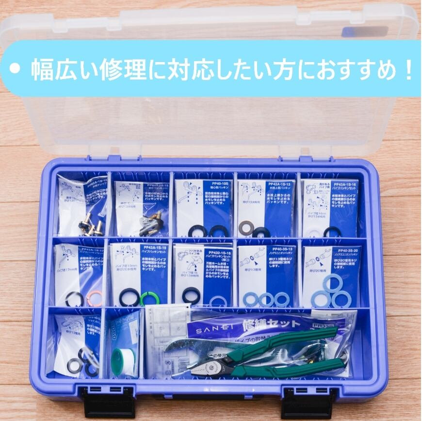 ・ジョイントパッキンx3・シールテーフx1・水栓スパナセットx1・ナット締付工具x1